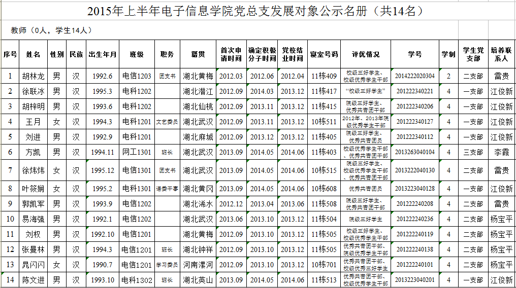 经考察和研究,学生党支部大会表决通过,电子信息学院党总支部委员会2015年6月17日审议决定,拟接收胡林龙等14位同志为中共预备党员,现将有关情况公示如下: