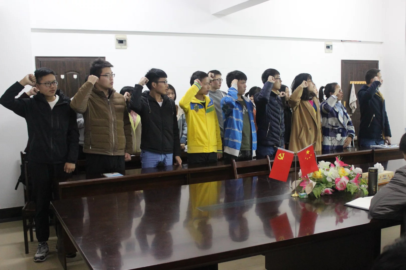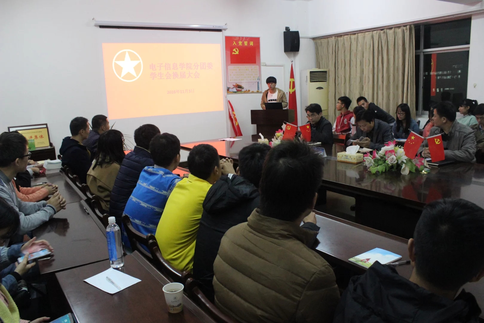 电子信息学院分团委学生会于11月3日晚六点半在北区科技楼405会议室顺利举办2016-2017届学生会换届大会。院党总支副书记闵艳林、学工办主任江俊新、辅导员王巍以及2015-2016届、2016-2017届学生会成员参加此次会议。会议由2015-2016届分团委副书记李伯暾主持。