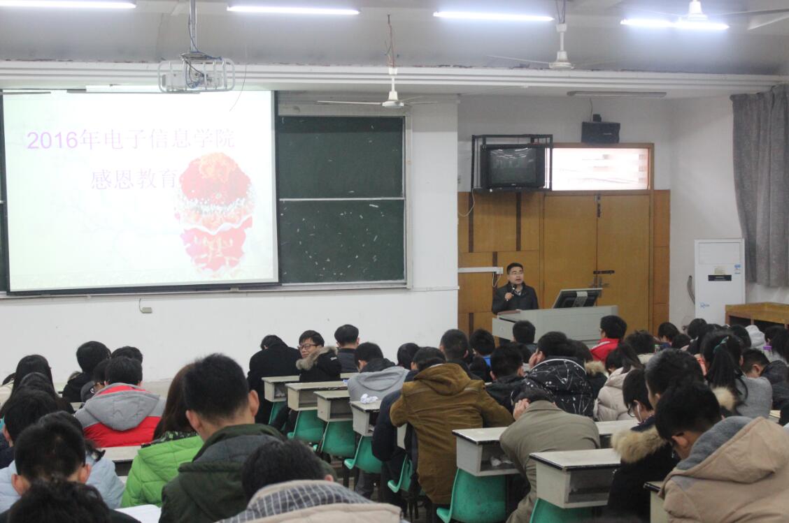 2016年12月20日,我院感恩教育主题大会在南区主教b01顺利召开。电子信息学院党总支副书记闵艳林,学工办主任江俊新,辅导员王巍,辅导员严丹,部分学生会干部和全体受助学生参加此次会议。会议由江主任主持召开。