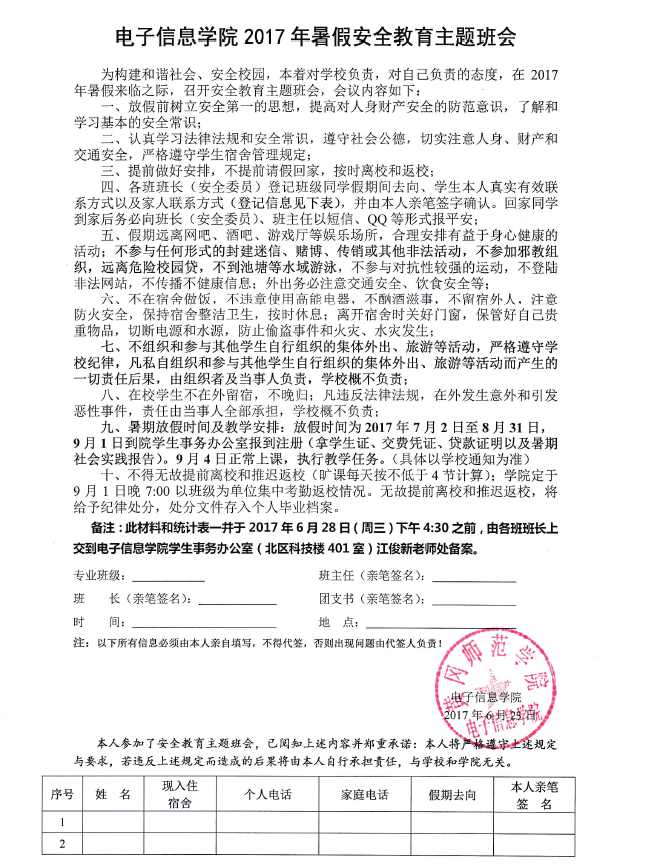 根据暑假前后学生工作的特点,各班要组织召开主题班会,组织全体学生签订《高等学校暑假安全告知书》,并做好会议记录。有针对性地加强以下方面的教育: