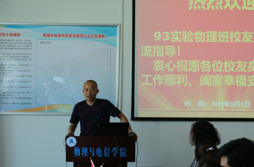 座谈会上,物理与电信学院院长兰智高教授代表学院介绍了学院的发展以及未来的规划和学校23年来的变化。他希望校友们常回母校看看,积极投入到母校的发展建设中来。班主任杨昌权老师怀着无比激动的心情,回忆了23年来对同学们的思念,对同学们成为基础教育的骨干感到欣慰,江俊新老师看见回校的学生回忆起当年的一幕幕,感慨万千,随即赠诗一首《送毕业生》。