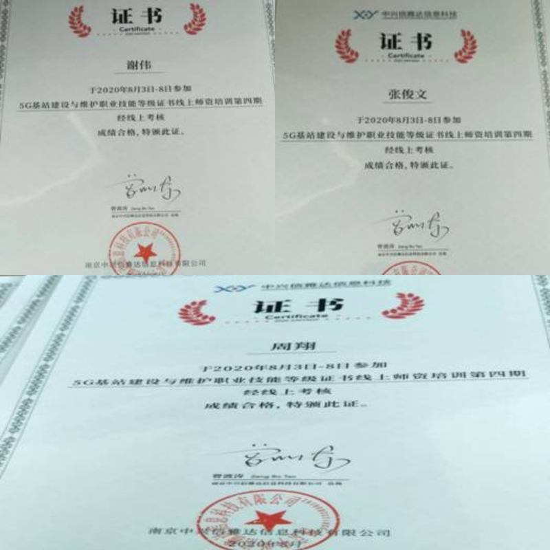 物理与电信学院在暑假期间组织相关老师(谢伟,张俊文,周翔)参与了5G基站建设与维护职业技能等级证书师资线上培训(8月3日-8日)并参加测试,获得师资培训证书。张俊文老师于8月24日-31日到重庆电子工程职业学院国培基地参加了1+X 5G基站建设与维护线下培训并结业。