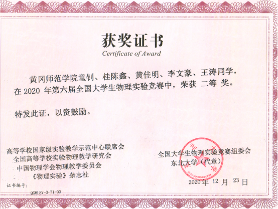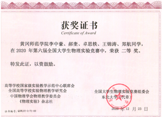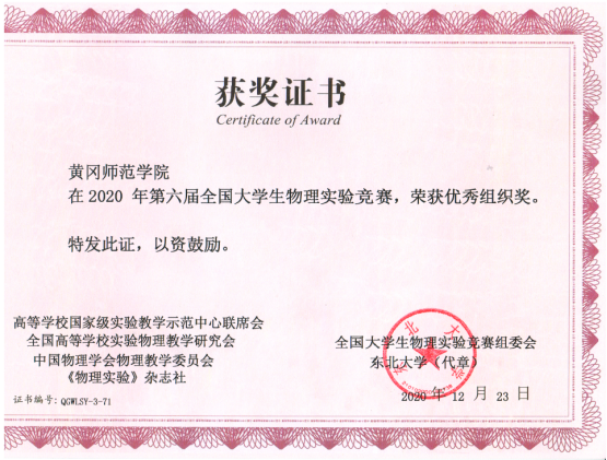 (通讯员 陈娇) “2020年全国大学生物理实验竞赛(创新)”经过多日紧张的线上初赛和复赛,于2020年12月17日落下帷幕。物理与电信学院组织5支代表队参加了本次竞赛,获得二等奖4项、优秀奖1项,获得优秀组织奖,我校3名教师担任竞赛评委。