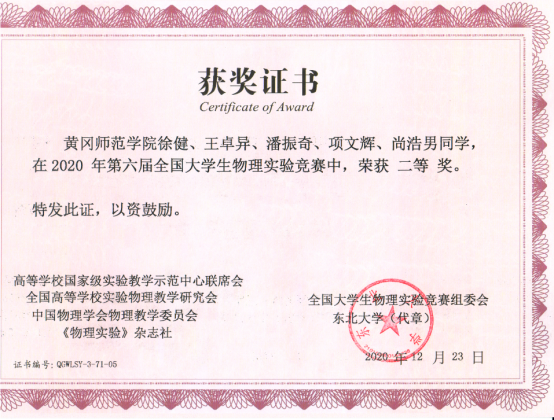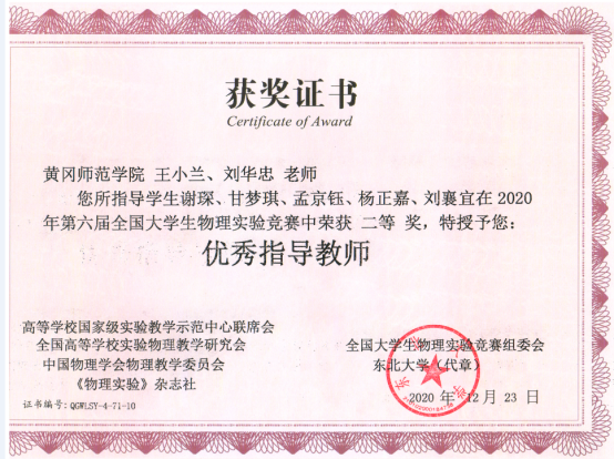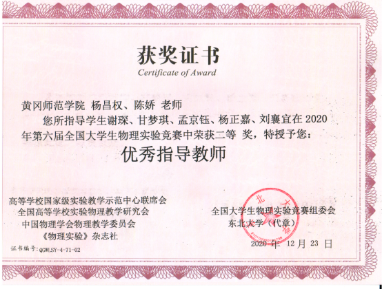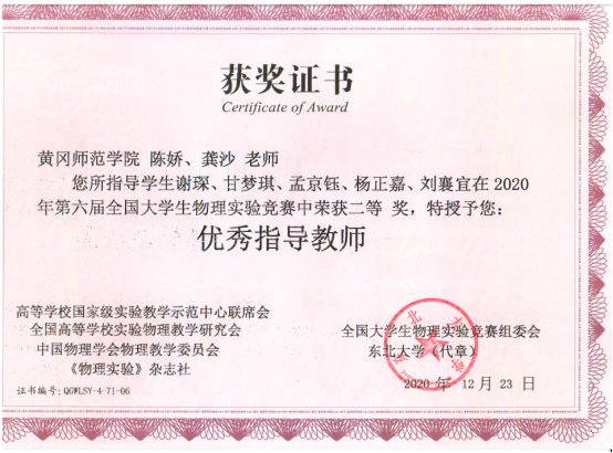 物理与电信学院高度重视大学物理实验竞赛工作,按照师范专业认证对学生教学技能的具体要求,强化大学生技能训练组织领导,学院成立了专班,组织了一、二、三级25名同学参与的跨年级5支竞赛团队,每队学生在2名教师的指导下,进行了为期2个多月的强化训练,按照组委会的技术标准,提交了视频文件和参与线上答辩。最终,谢琛、童钊、徐健、李中豪等为代表的四支参赛队伍获得二等奖;杨昌权、王小兰、兰智高、陈娇、龚沙、刘华忠等六位教师被评为本次竞赛的优秀指导教师;学校被评为优秀组织单位。