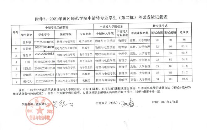 经过笔试和面试,2021年黄冈师范学院申请转专业学生(第二批)考试成绩公示如下: