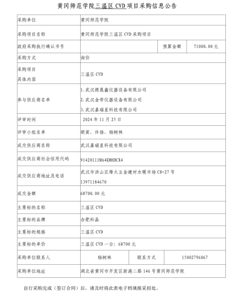 黄冈师范学院三温区CVD公开面向社会询价招标,并在物理与电信学院网上公示,共收到有效标书3份,学院组织人员开标,开标结果为:武汉嘉瑞星科技有限公司以人民币68700元的价格中标。